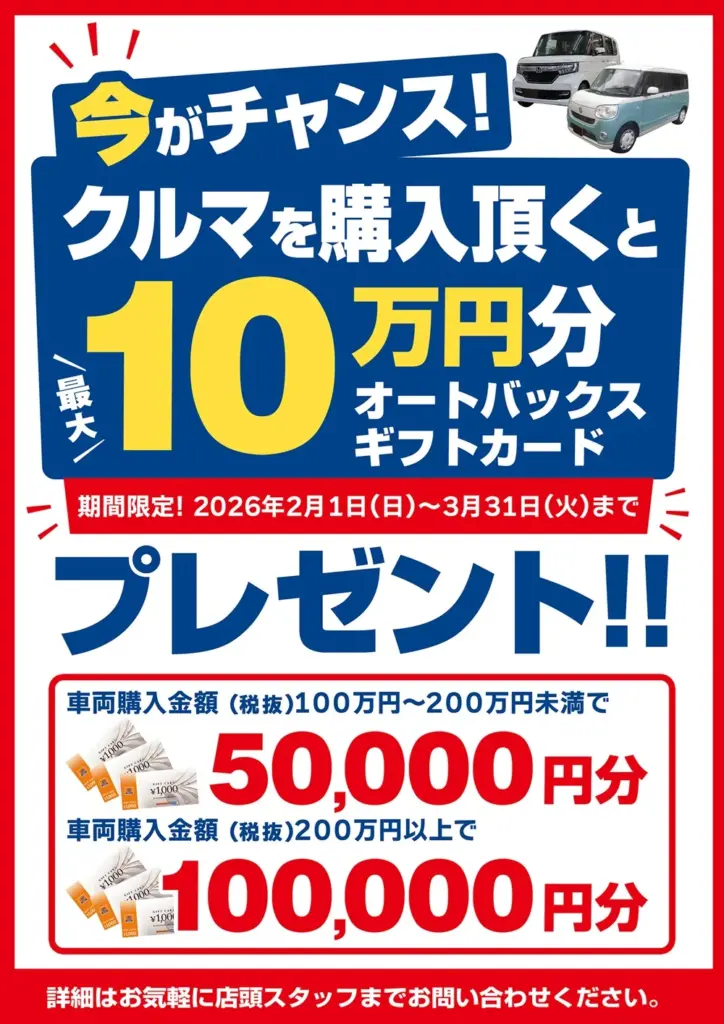 古いナビを使っている方や、高機能モデルへの買い替えを検討している方には絶好のチャンスです。 - 車買取・販売強化: 愛車を高く売りたい方や、新しい車への乗り換えを考えている方も、