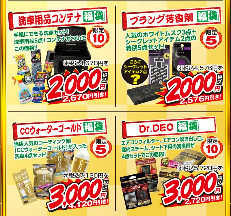 - 種類が豊富: 洗車グッズ福袋、オイル福袋、ドライブレコーダー福袋、プレミアム福袋など、