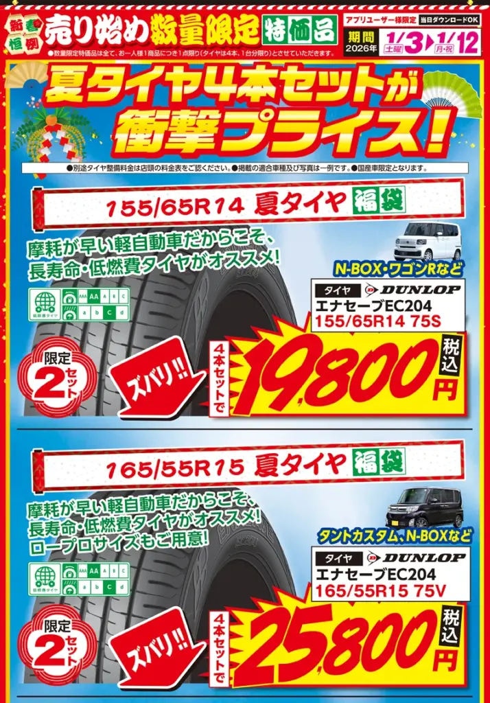 お一人様1種・1個までという制限があるので、欲しい福袋は早めにゲットする必要があります。 - タイヤ4本セット衝撃プライス: 新年は新しいタイヤで快適なドライブを。