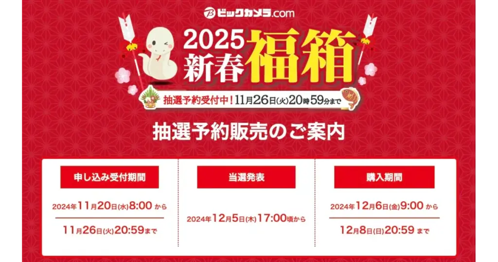 ビックカメラの福箱抽選は毎年11月下旬の水曜日に開始されるパターンが続いています。