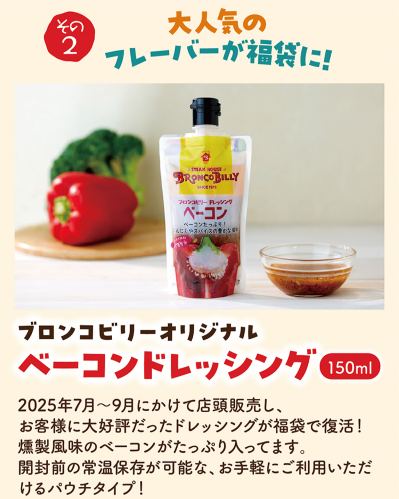 | 大人気のフレーバー | ブロンコビリーオリジナルのベーコンドレッシング | ファンに人気の商品が中身に含まれる |