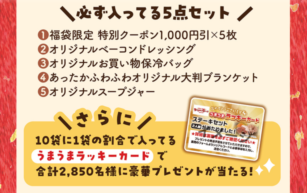 | フードクーポン 5,000円分 | 1,000円引クーポンが5枚 | 福袋価格を全額相殺するメイン特典 |
