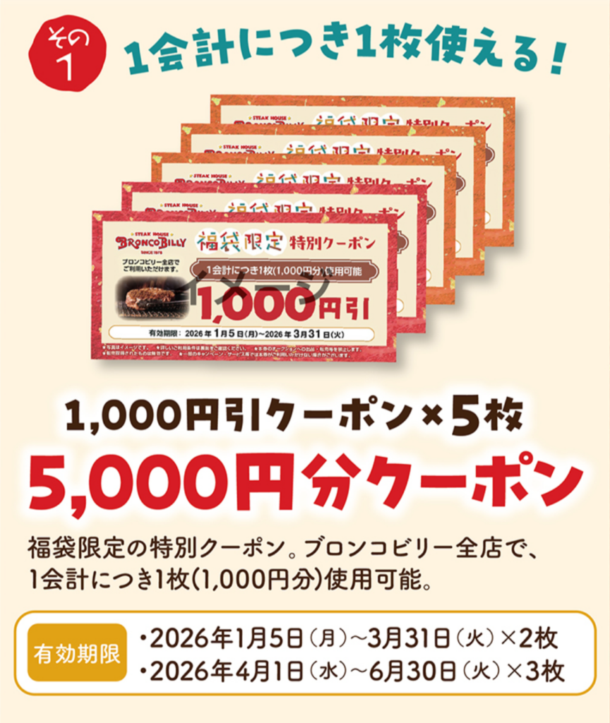 ブロンコビリー福袋2026は、価格5,000円(税込)に対して同額5,000円分のフードクーポンが中身となる、