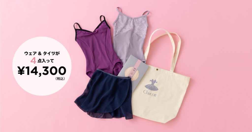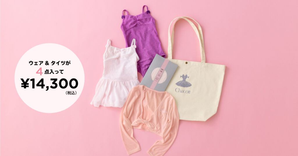 - 内容:レオタード、トップ、ボトムス、タイツ(ジュニア&キッズ)、トートバッグ、クーポン