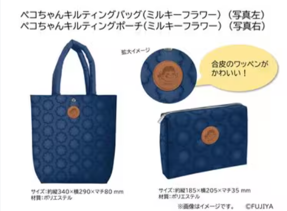 5,500円という価格で、ミルキーフラワー柄のキルティングバッグや首振りペコちゃん人形など、