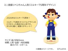 まず目玉となるのが、ミルキー75周年を記念した特別デザインの首振りペコちゃん人形です。