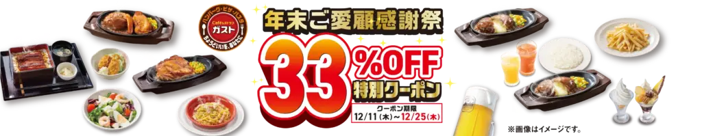 ガストとバーミヤンの年末ご愛顧感謝祭クーポンキャンペーンは、2025年12月25日までの15日間限定です。