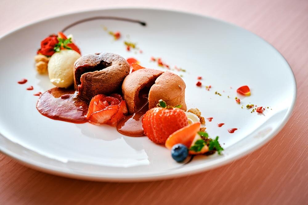 チョコレート生地のフォンダンショコラには甘酸っぱいいちごソースが、
