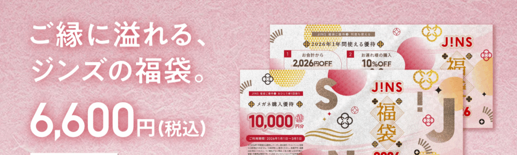 JINS福袋2026は、税込6,600円で最大14,000円分のメガネ購入優待が当たる、驚異的なコスパを誇る福袋です。
