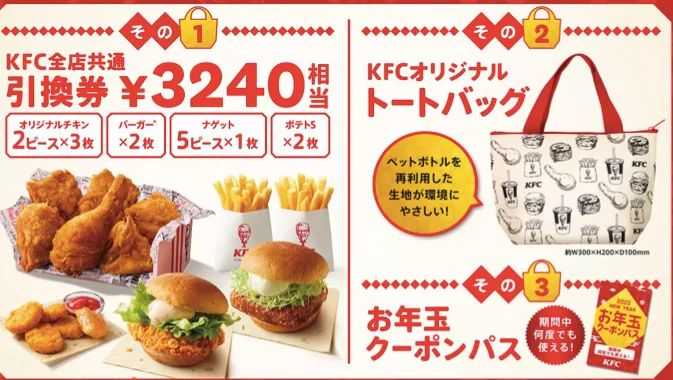 この年の特徴は、オリジナルチキン2ピース×3枚、バーガー×2枚、ナゲット5ピース×1枚、