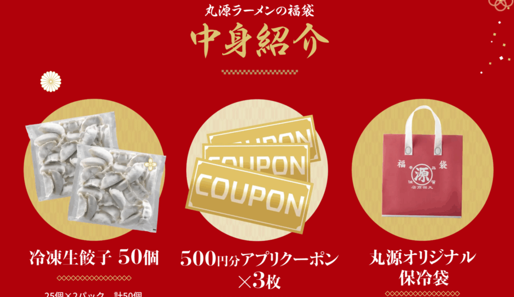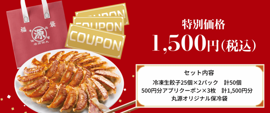 - 丸源ラーメン福袋2026の中身ネタバレ(餃子50個+クーポン1,500円分)