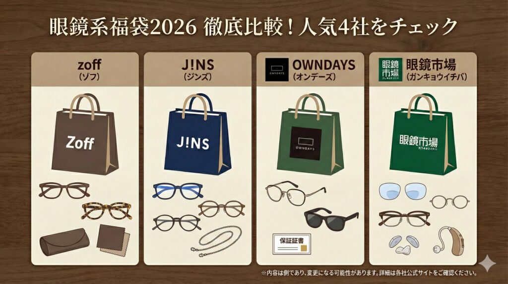 【眼鏡福袋2026】徹底比較完全ガイド!Zoff,Jins,OWNDAYSに眼鏡市場の中身や値段とおすすめ度とコスパ、口コミや人気度を徹底比較!