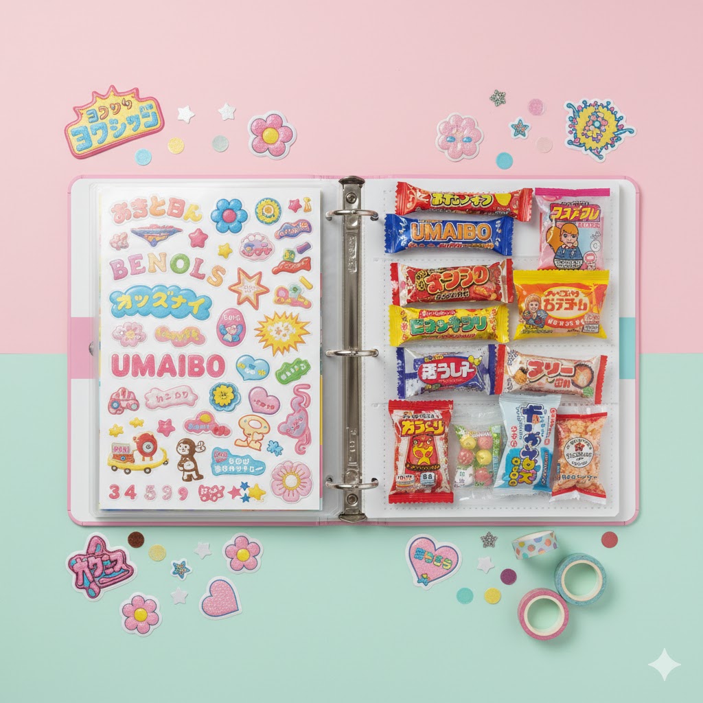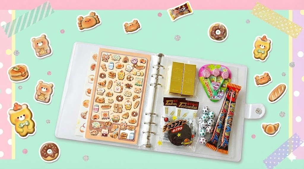 カラフルなシールと、可愛いパッケージのお菓子が一緒に並んだページは、写真に撮ると本当に映えるんです。