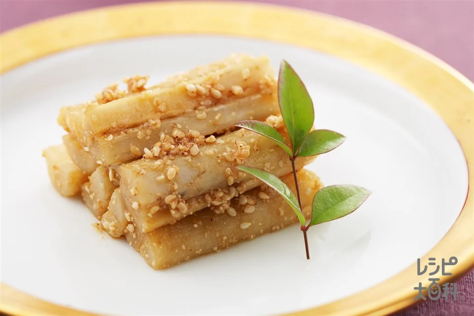 すりこぎや麺棒などで叩いて繊維を開き、すりごまや練りごまで和えた料理です。