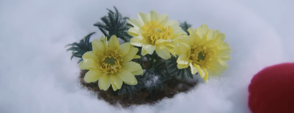 そして、このシーンのクライマックス。雪の中から、黄色いフクジュソウのような花が顔を出しているんです。