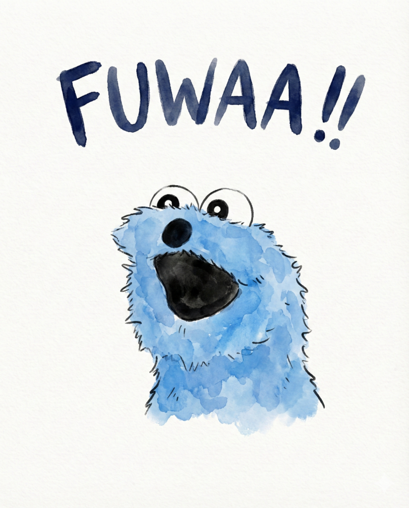青くてふわふわのクッキーモンスターみたいな雰囲気で、見ているだけで元気が出てくるイラストなんですよね。