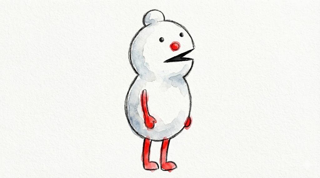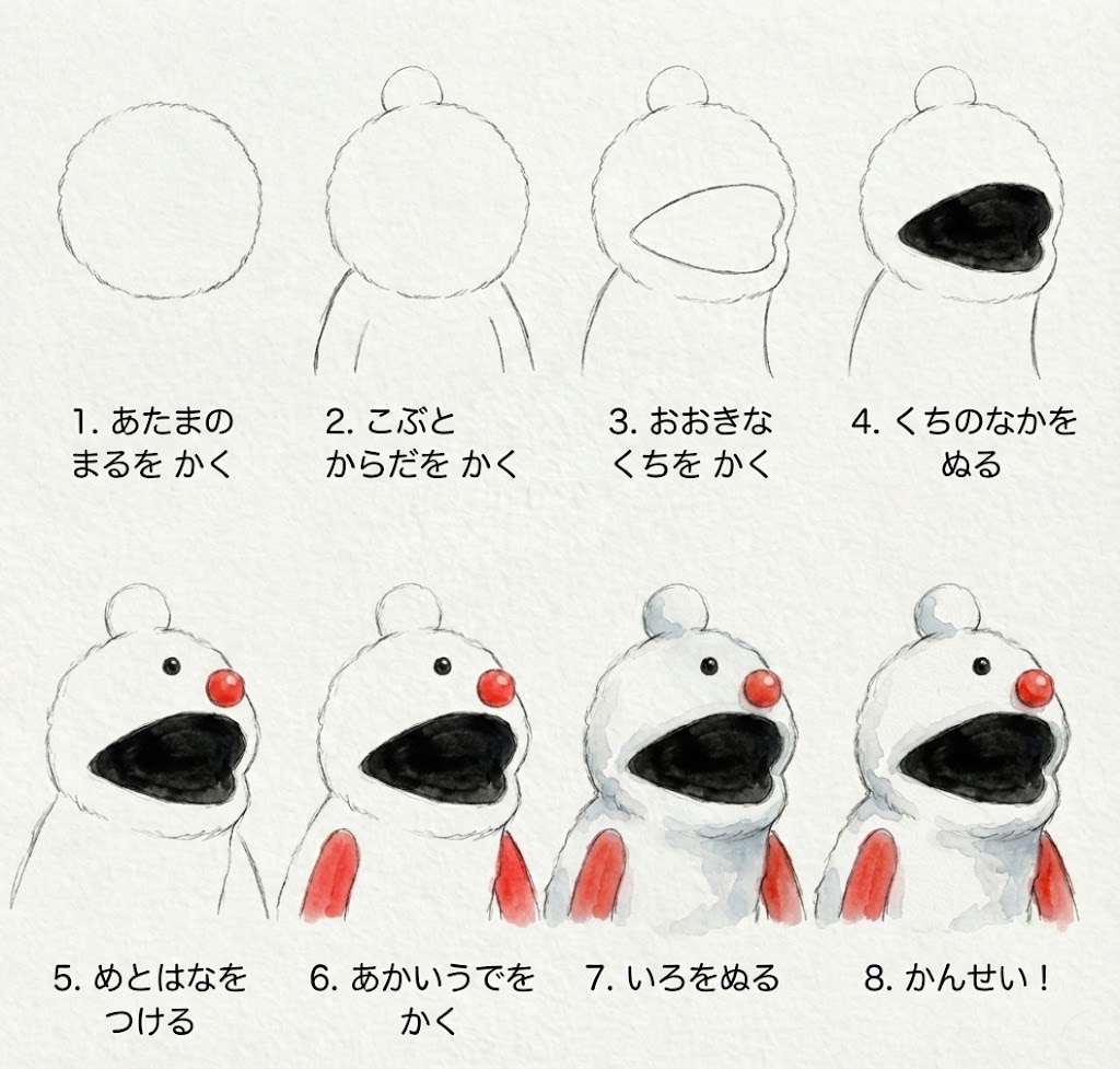 この描き方、8つのステップで完成します。白い体に、赤い鼻とほっぺ、そして大きな黒い口。