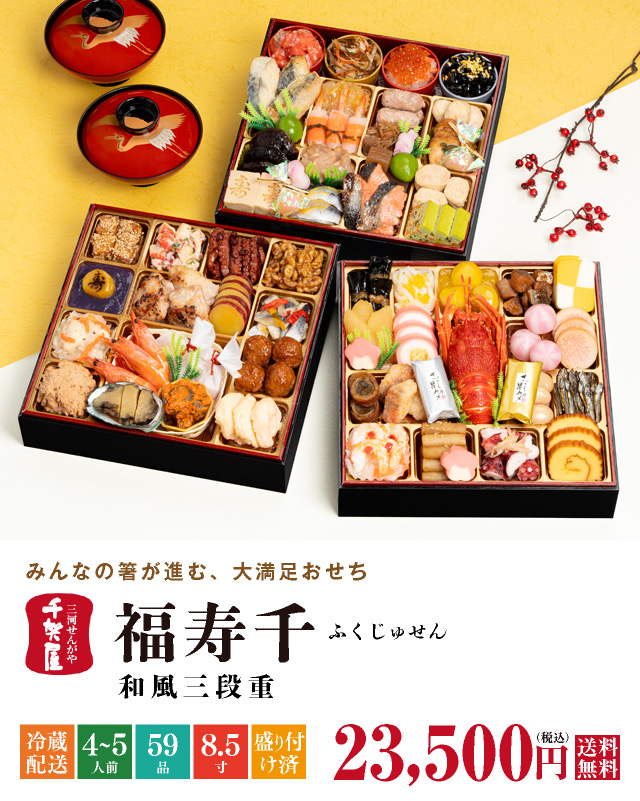 「福寿千(ふくじゅせん)」は、価格が23,500円(税込)で、推定60品目が入った豪華版です。