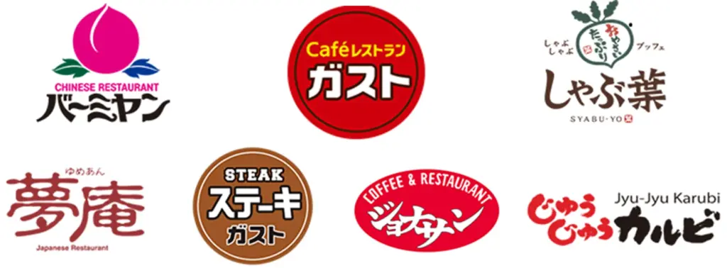 ガスト、バーミヤン、ジョナサン、夢庵、グラッチェガーデンズ、しゃぶ葉(一部)、から好し(一部)など、